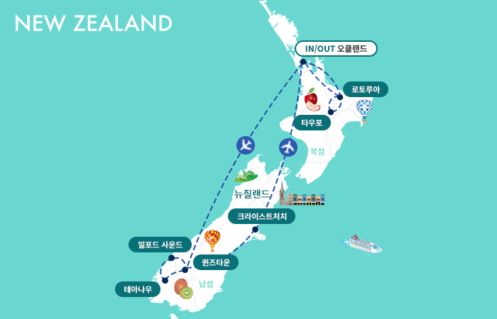 국내선 청사로 이동 [13:25] 국내선 NZ639편 으로 오클랜드 출발 (비행시간 약 1시간 55분) *현지 항공 예약 상황에 따라 항공편 및 탑승시간이 변경될 수 있습니다. *항공사에 따라 기내 서비스가 유료로 진행될 수 있습니다.